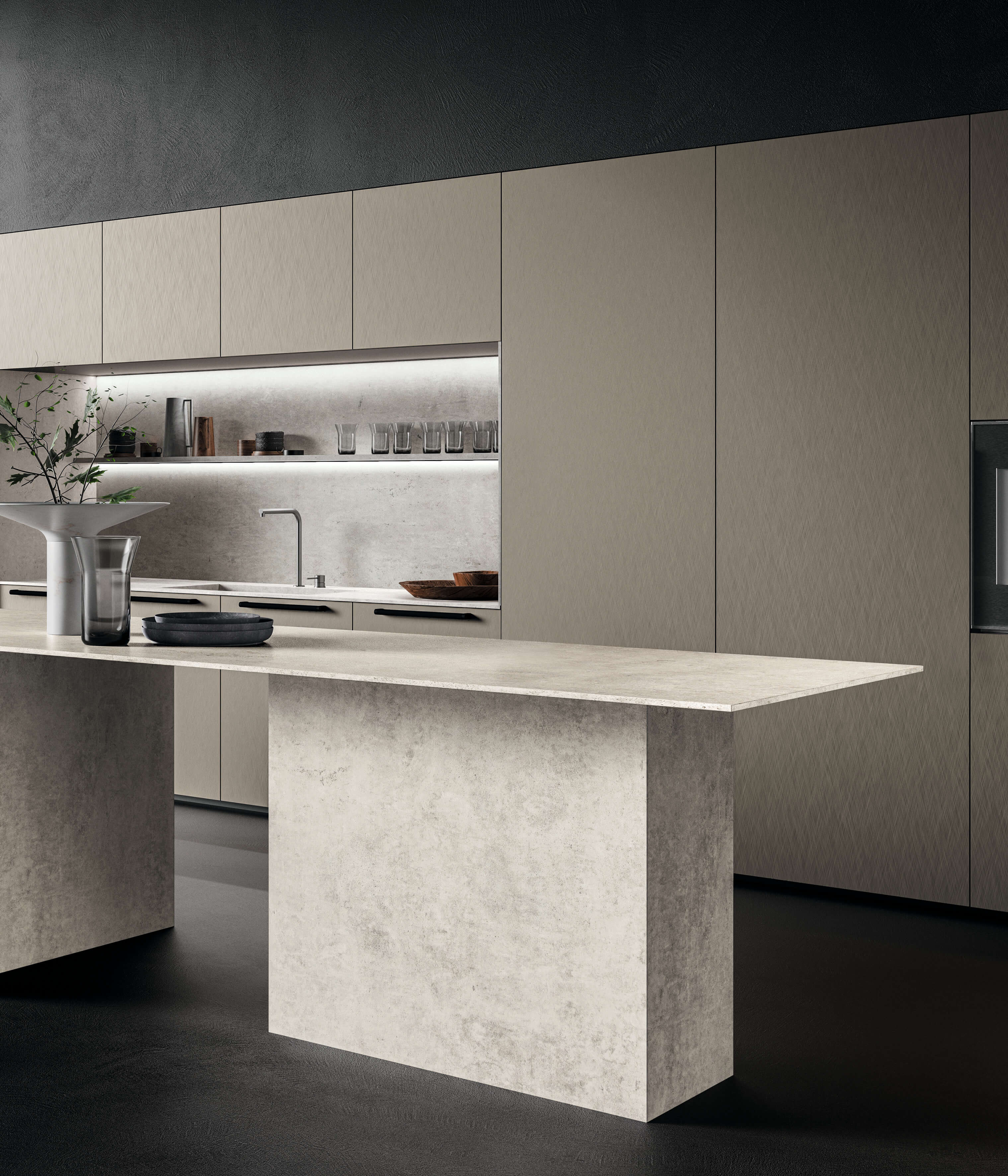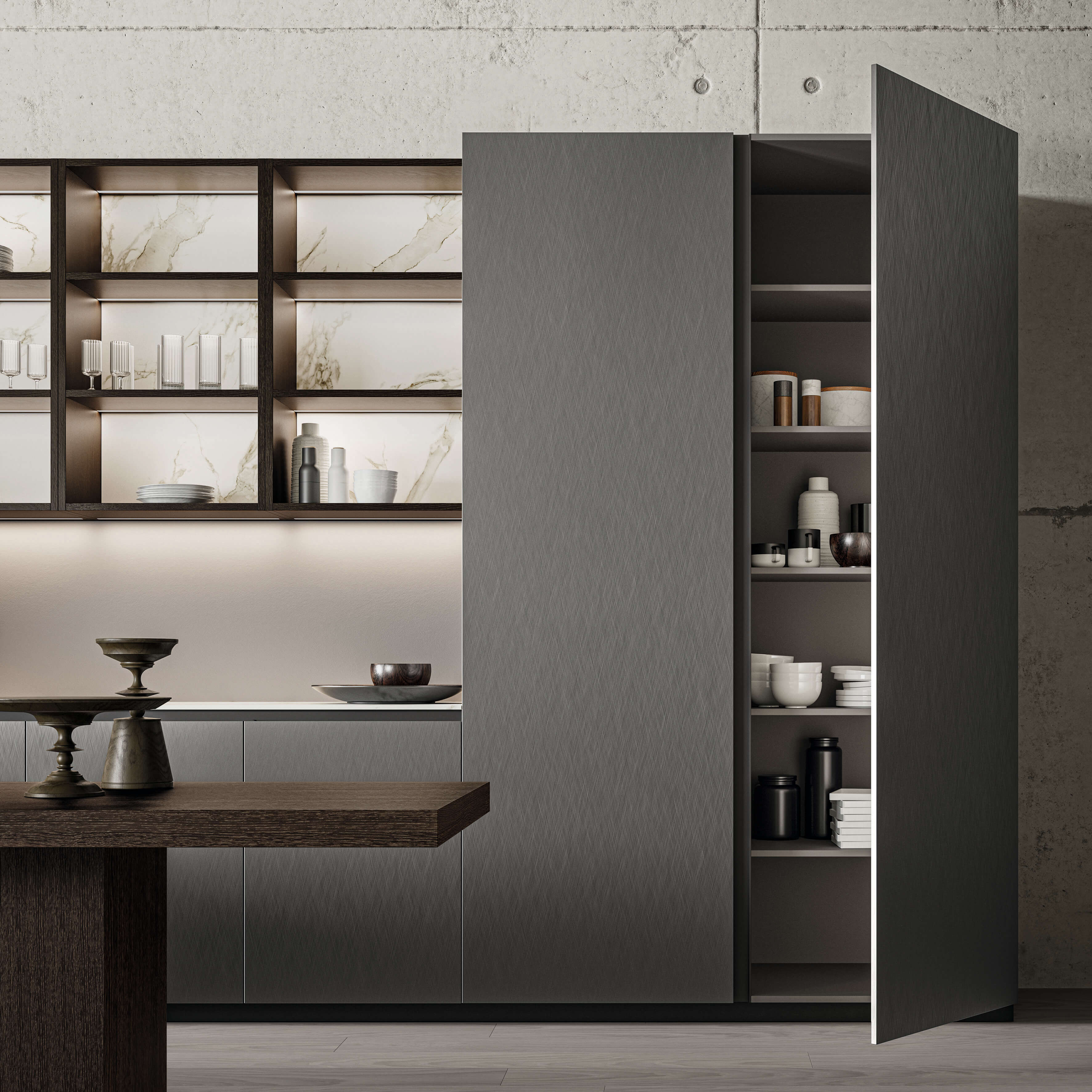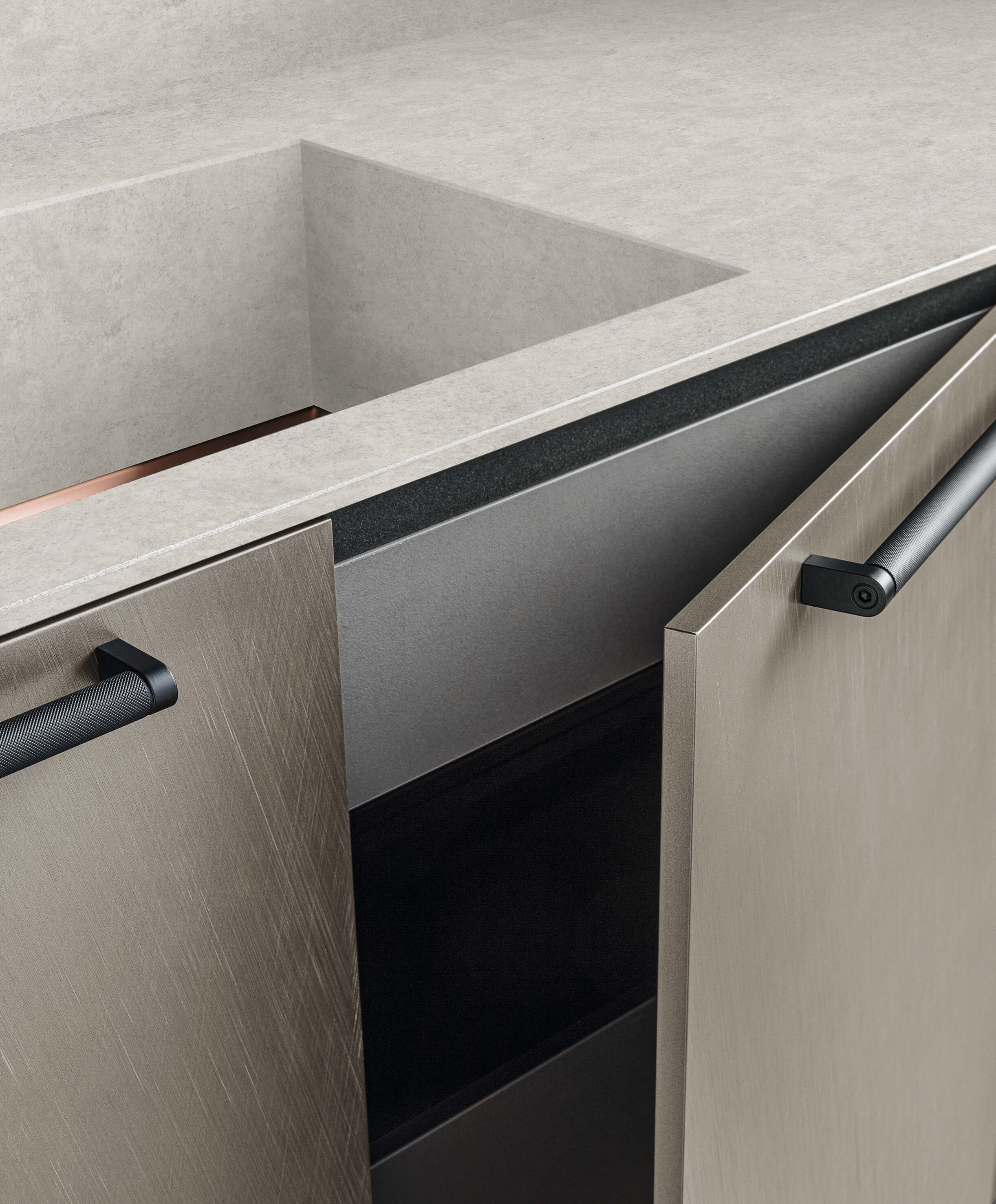 Металлическая отделка Comprex воплощает в себе утонченную современную элегантность благодаря брашированию, которое создает едва заметную линейную текстуру. Это придает изделиям вневременной стиль, который идеально вписывается в кухни любого дизайна, от классического до современного. Эти легкие и прочные материалы не только выглядят оригинально, но и имеют прочную поверхность, за которой легко ухаживать.
