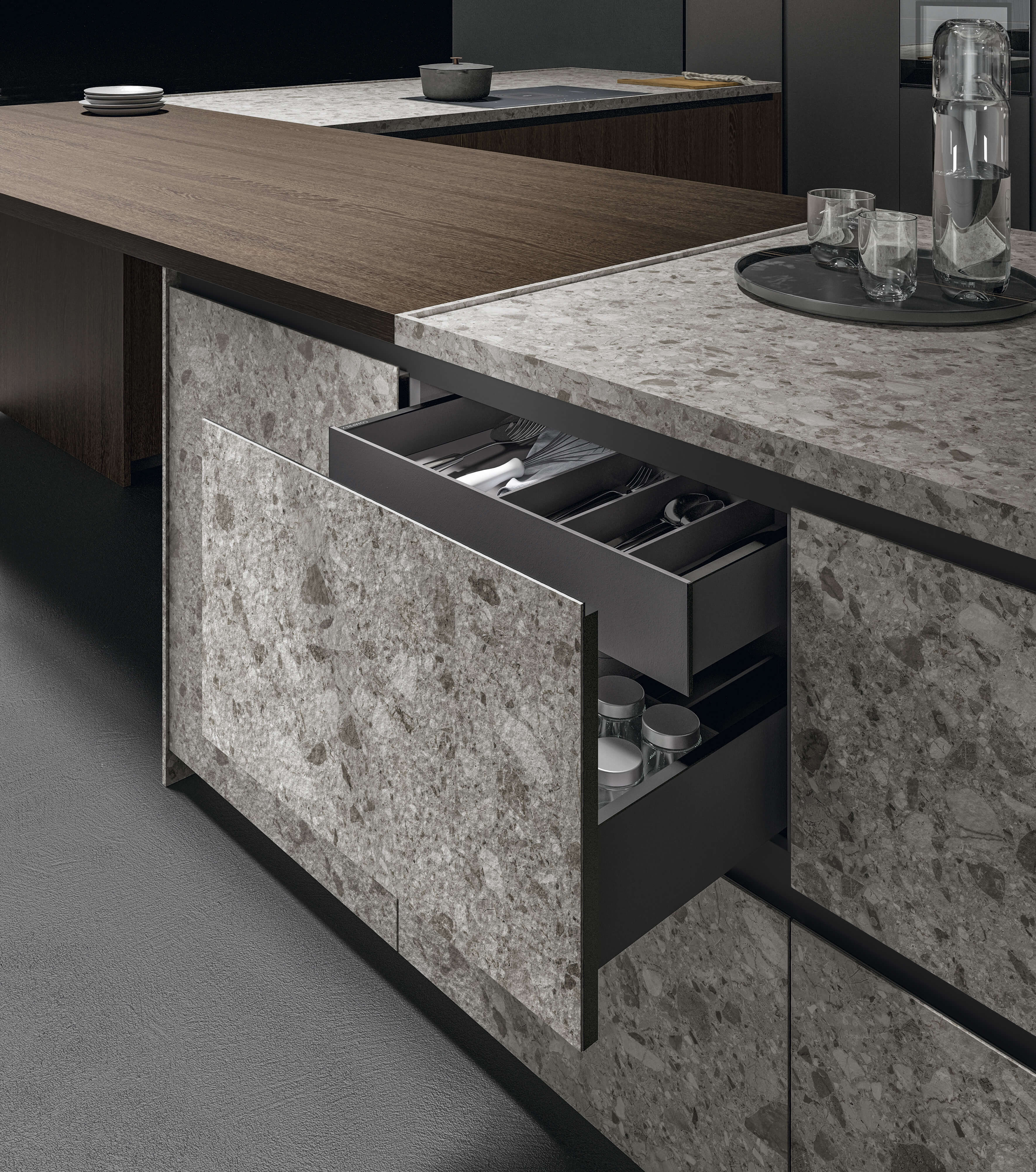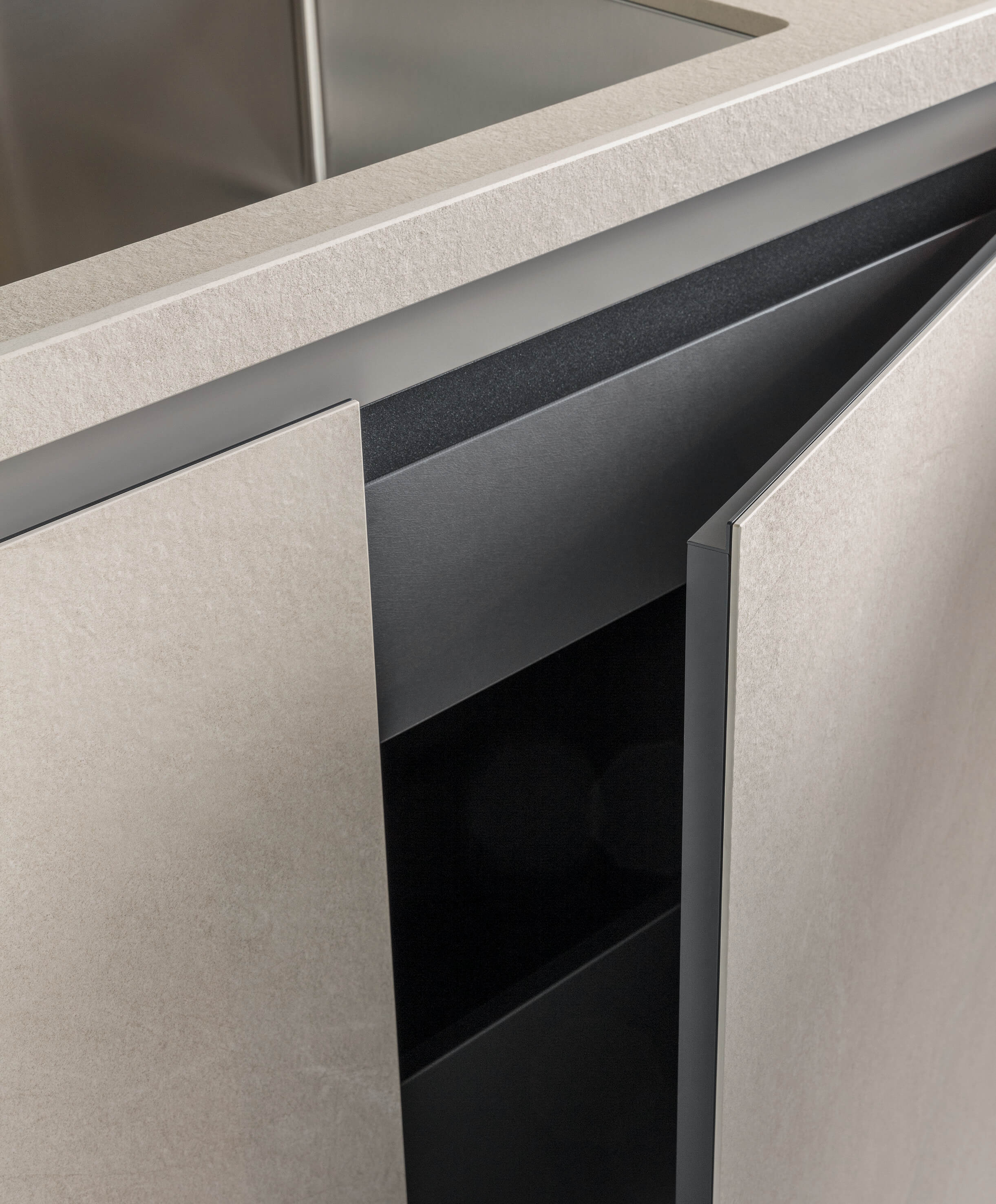 Компания Comprex переосмыслила эстетику дверей в рамах, предложив современный и оригинальный подход. Этот дизайн, воплощенный в кухне Torino Elite, отражает суть подхода компании к мастерству исполнения, привнося элегантность и инновации в процесс приготовления пищи. Дизайн дополнен ручкой L, чья четкая геометрическая форма сочетается с профилем двери, создавая изысканный современный вид.