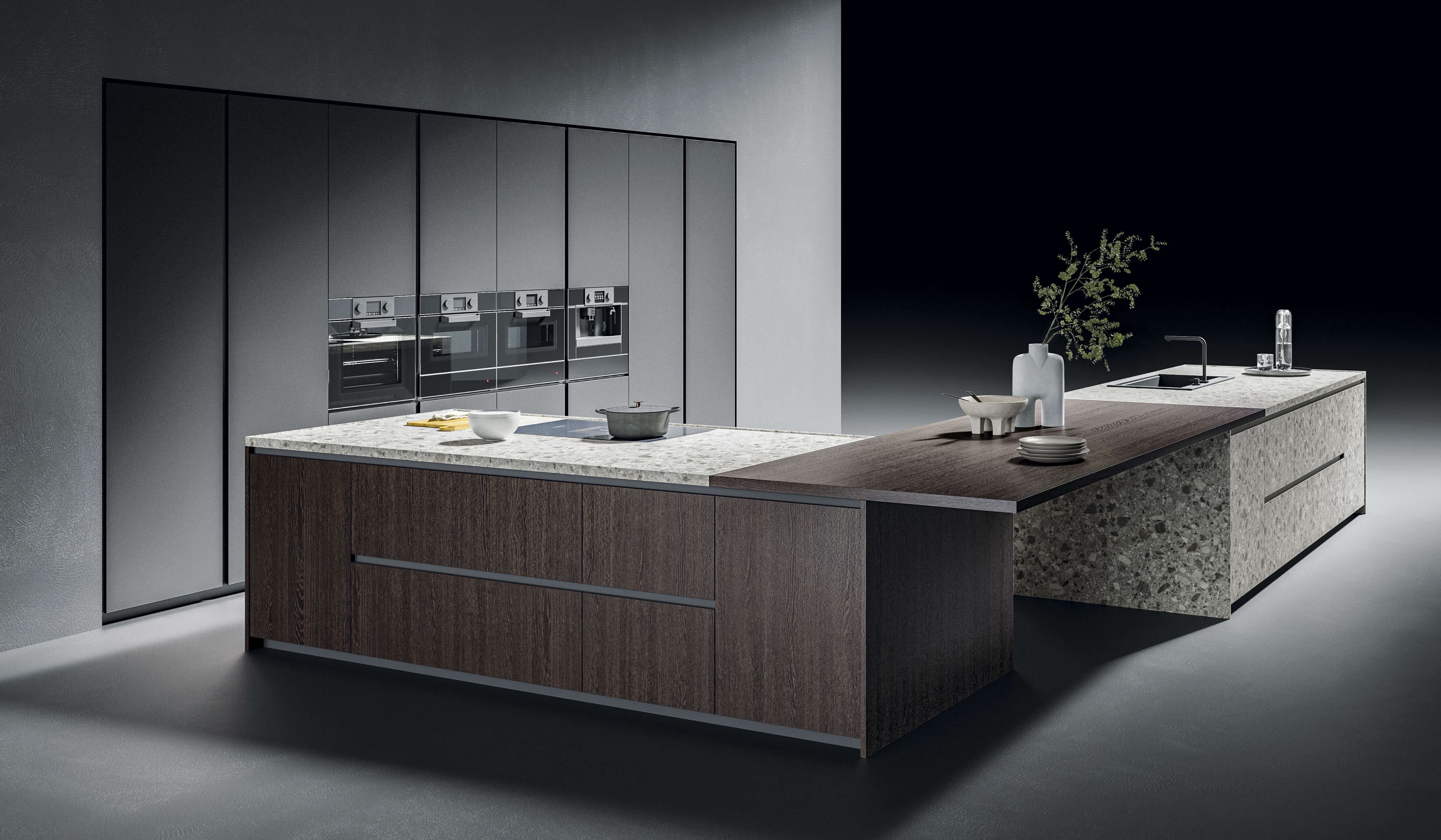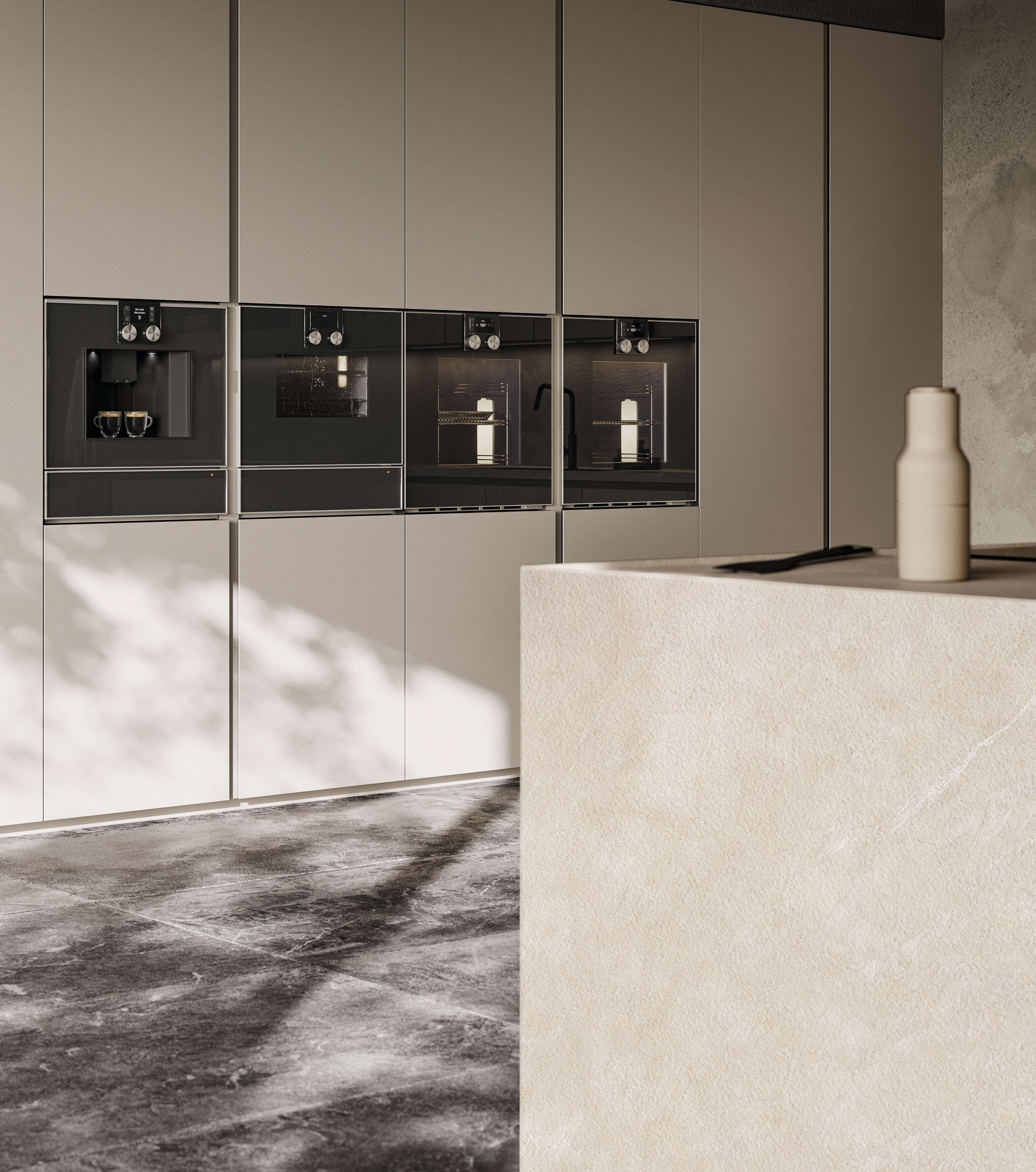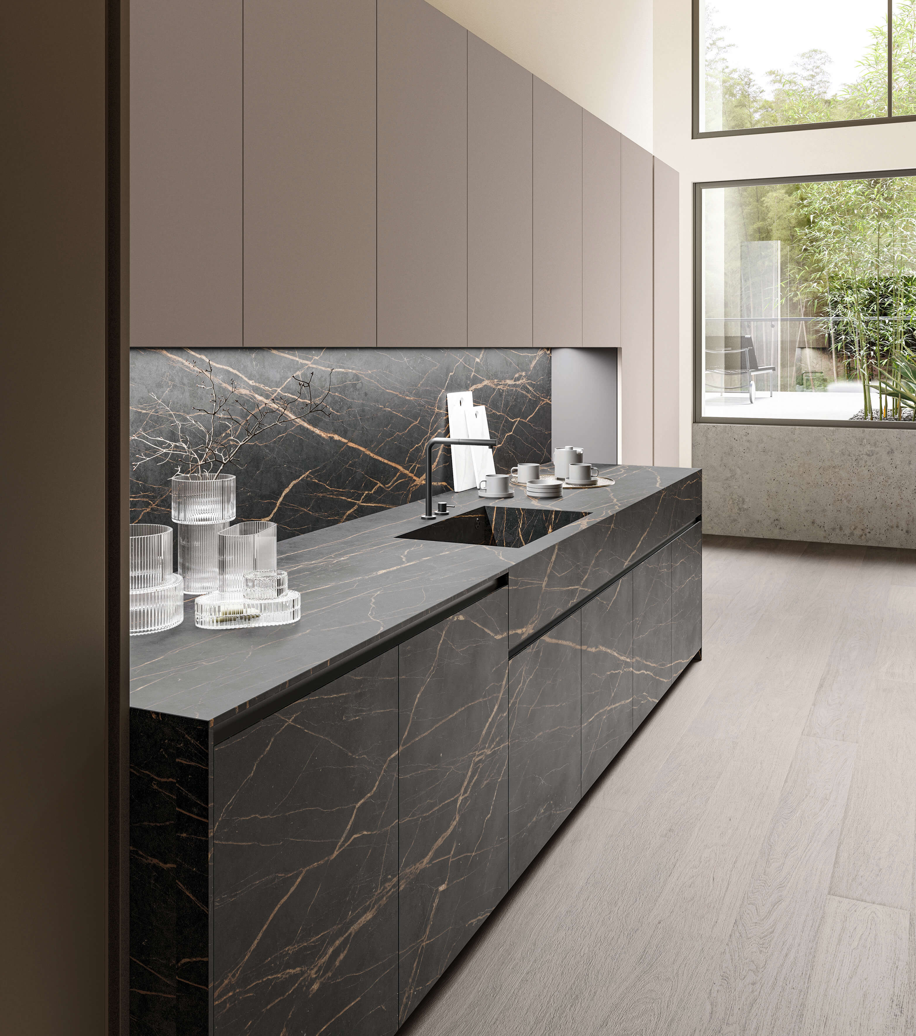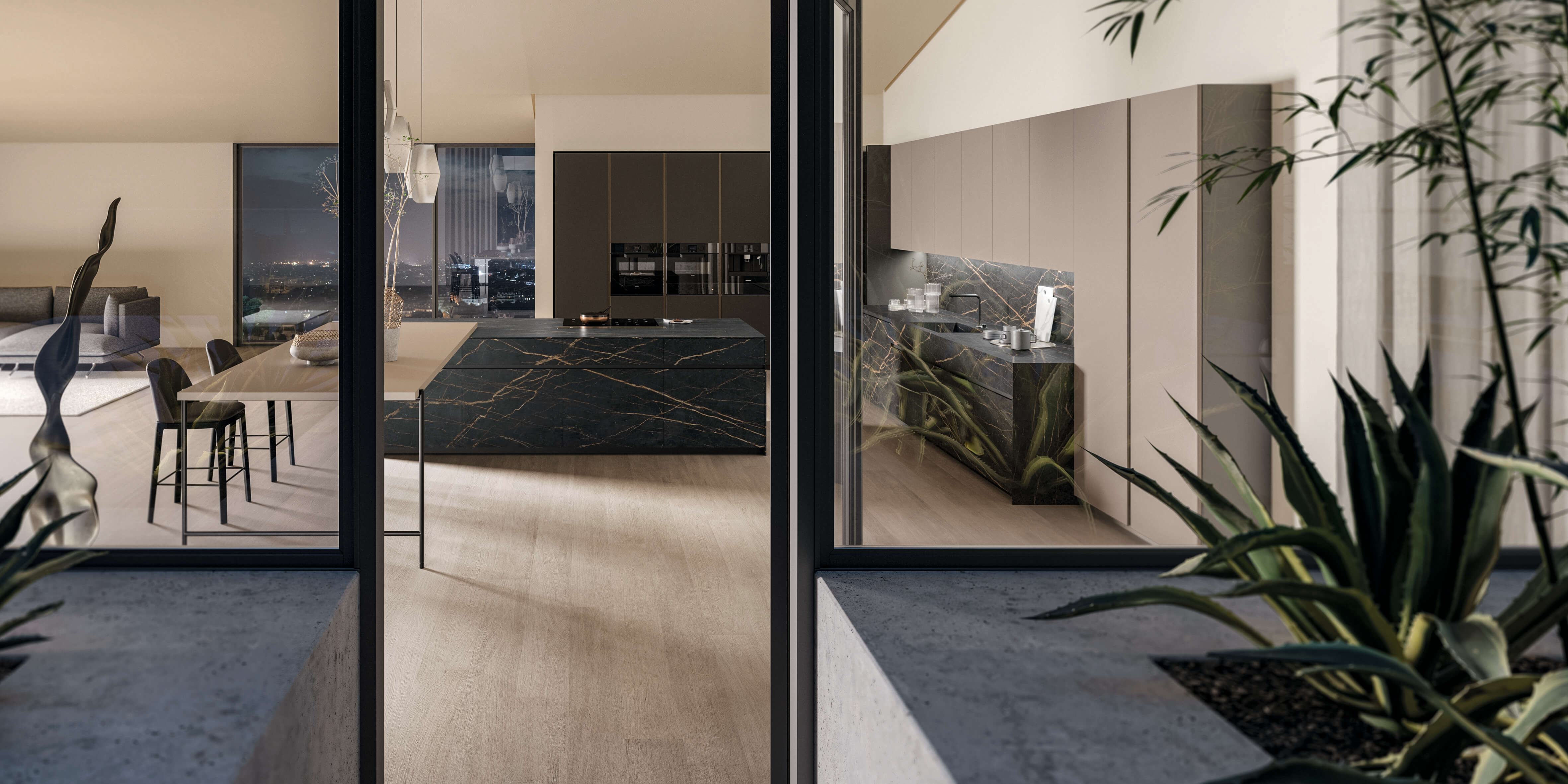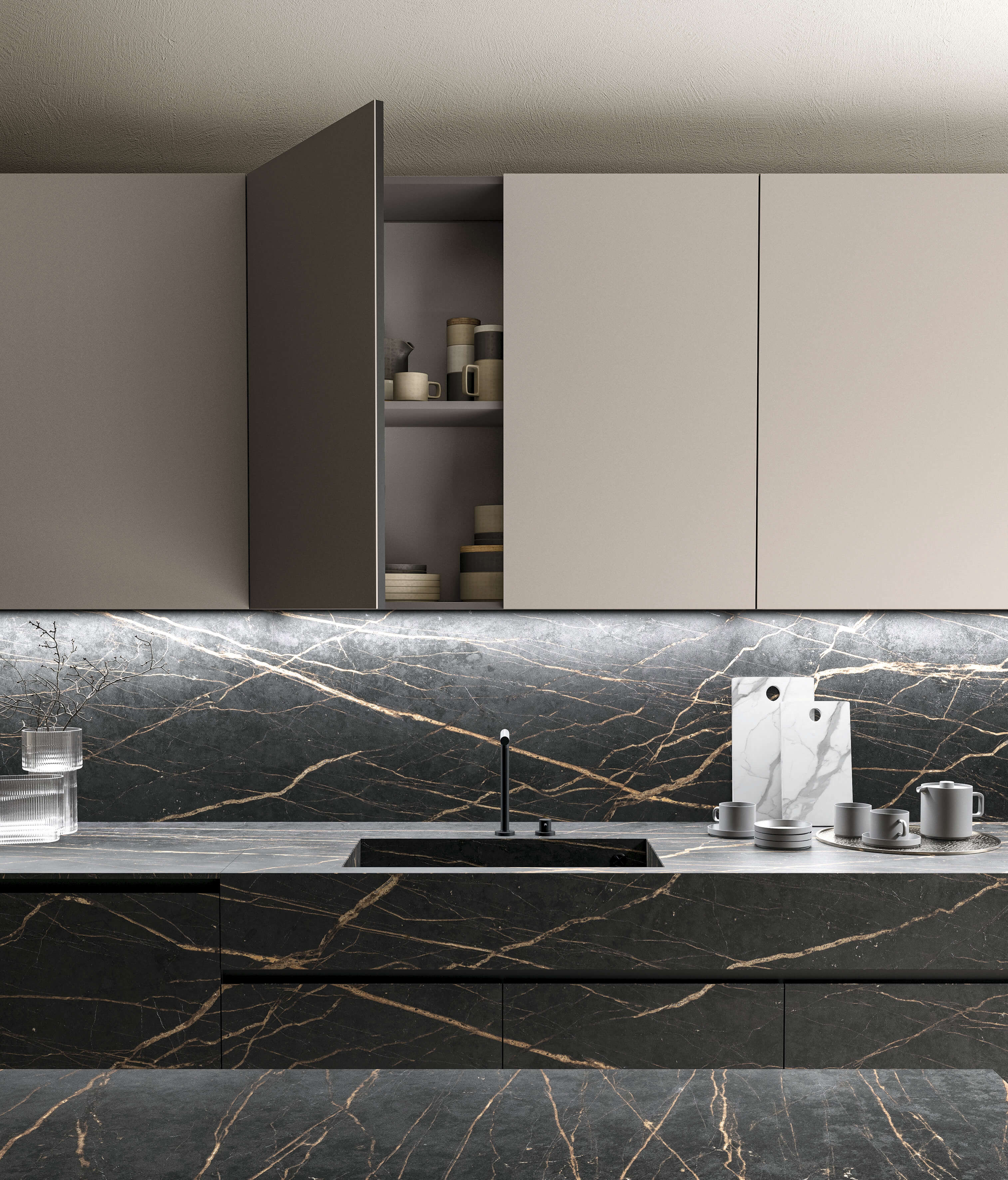 Кухня Torino Elite воплощает в себе суть проекта, который плавно перемещается между гармоничными пропорциями, изысканной толщиной и элегантностью инновационных материалов, сочетающихся со сложной технологией дверного полотна из алюминиевой рамы.