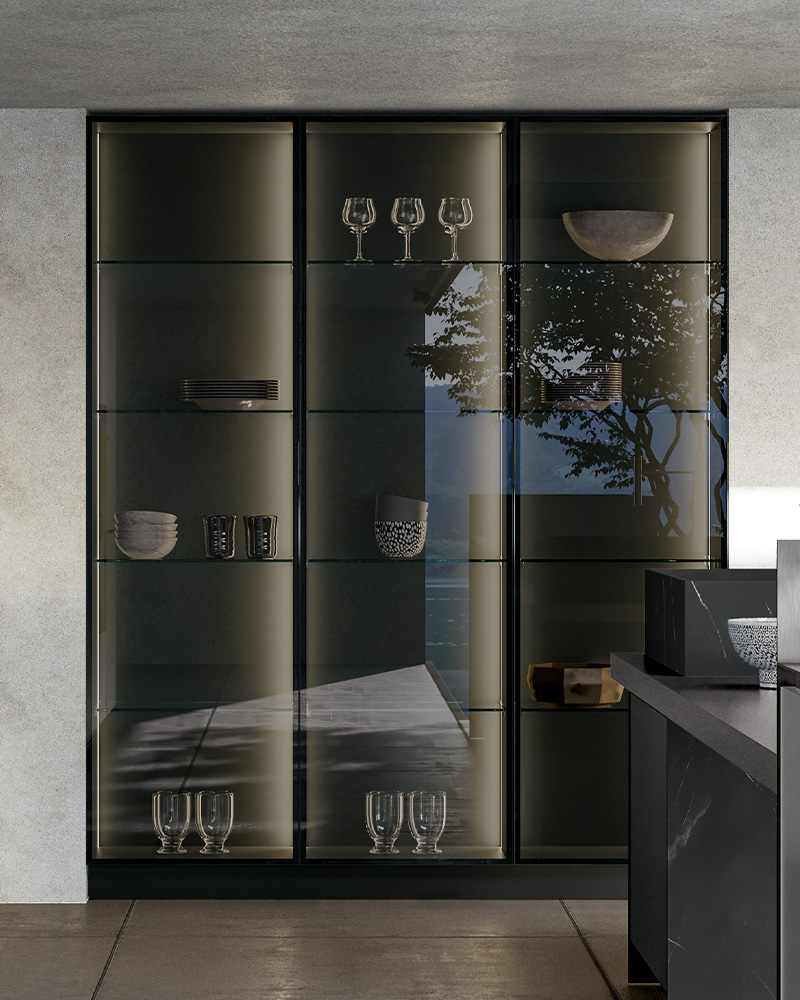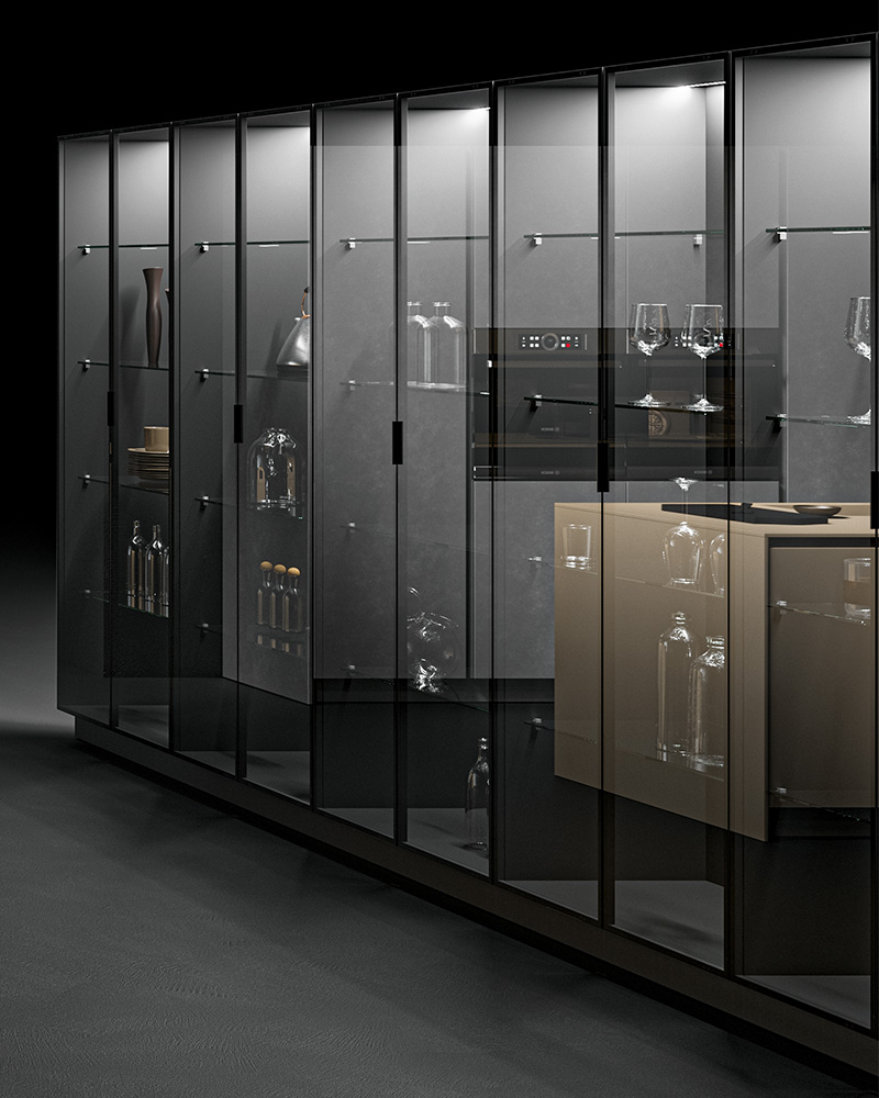 Легкость модели Verona Design Lab сравнима только с заботой о ее эстетике, настраиваемой с текстурной или лакированной отделкой для структуры и дверцами из дымчатого закаленного стекла или с эффектом ткани.
